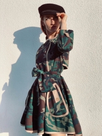 Двубортный тренч (тренчкот) оригинального кроя от ELLA Abushkevich. Эксклюзивная модель! Детали: приталенный силуэт, пышная двусторонняя юбка «Каскад», рукав ¾, воротник «стойка», по бокам – два накладных кармана. Декор: контрастный кант цвета беж. К плащу прилагается пояс-бант. На линии плеч – погоны, на рукавах – манжеты. Застежка – фирменные пуговицы «кокос» цвета беж.