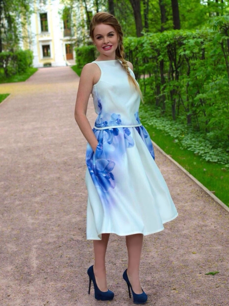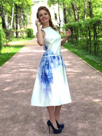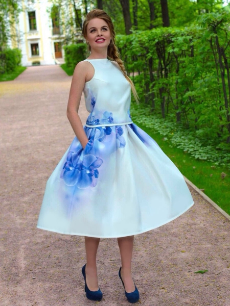 Элегантный и очень женственный летний сет: юбка с бантовыми складками и оригинальный ассиметричный топик с необычным «крылышком» на плече. По бокам на юбке – два кармана. Эксклюзивная модель с авторским принтом на ткани.