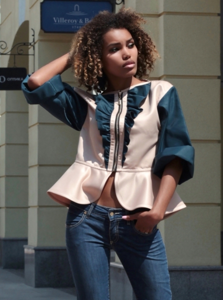 Оригинальная ветровка с баской и жабо. Детали: красивое цветовое сочетание, приталенный силуэт, вырез «лодочка», спереди застежка – молния, длинные рукава. Эксклюзивная модель!